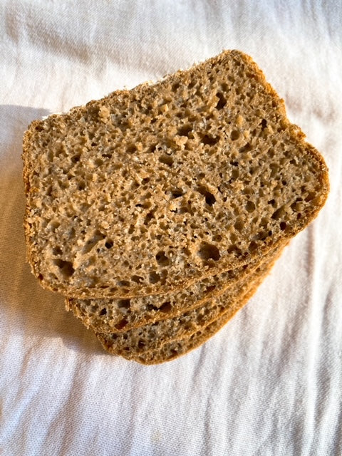 This is my answer to a typical German bread - volkornbrot. With maximum whole grain flavor from spelt, rye, and wheat which we grind ourselves for freshness. It is a loaf created with two starters. There is an appealing light crunch from chia seeds. Wonderful with butter, cheeses, jams and as a base for open faced sandwiches.